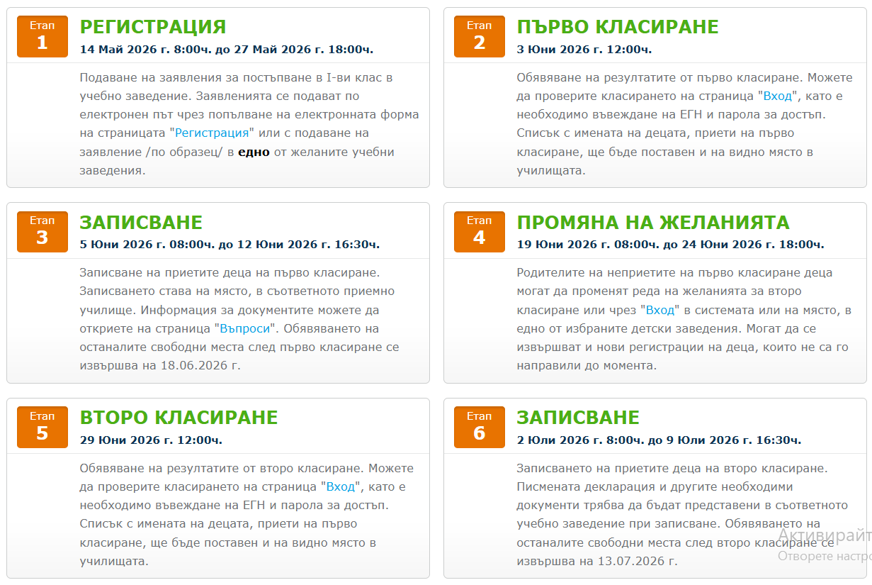 Кандидатстване за прием в І-ви клас се извършва по електронен път или с подаване на заявление /по образец/ в едно от желаните от родителите учебни заведения. Класирането и записване на деца в І-ви клас се извършва поетапно в определените в Правилник срокове и етапи.