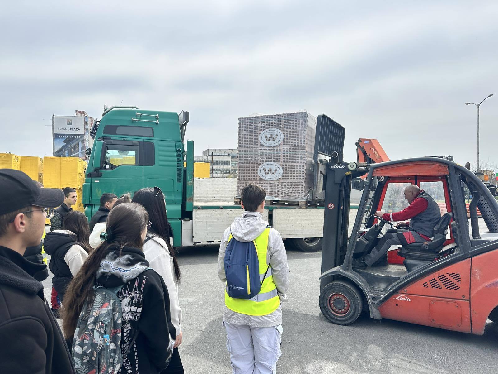 Учениците наблюдаваха работа със специализирана техника, включително мотокари, и проследиха процесите по товарене, разтоварване и обезопасяване на товарите, като имаха възможност и да се качат на мотокар и да видят отблизо условията, в които работи операторът.
